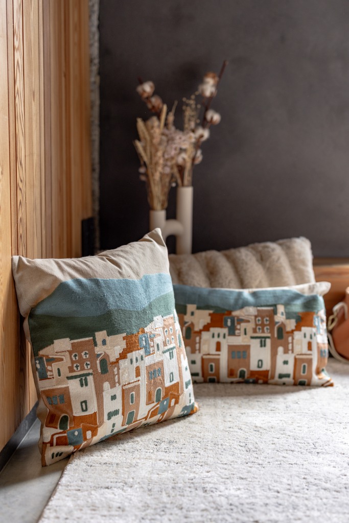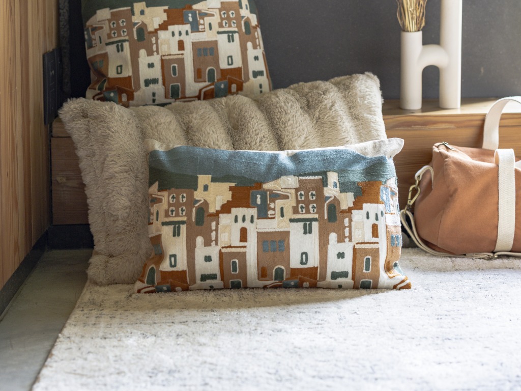 La collection de coussins brodés ELIE Vivaraise est une invitation au voyage en terre méditerranéenne. Les maisonnettes, aux façades blanches, accrochées à la falaise d’un village perché nous transportent dans un paysage d’évasion. Ses couleurs naturelles et douces se marient parfaitement aux belles matières comme le coton et le lin. Associez les à d’autres coussins unis et sublimez ainsi votre canapé avec distinction.