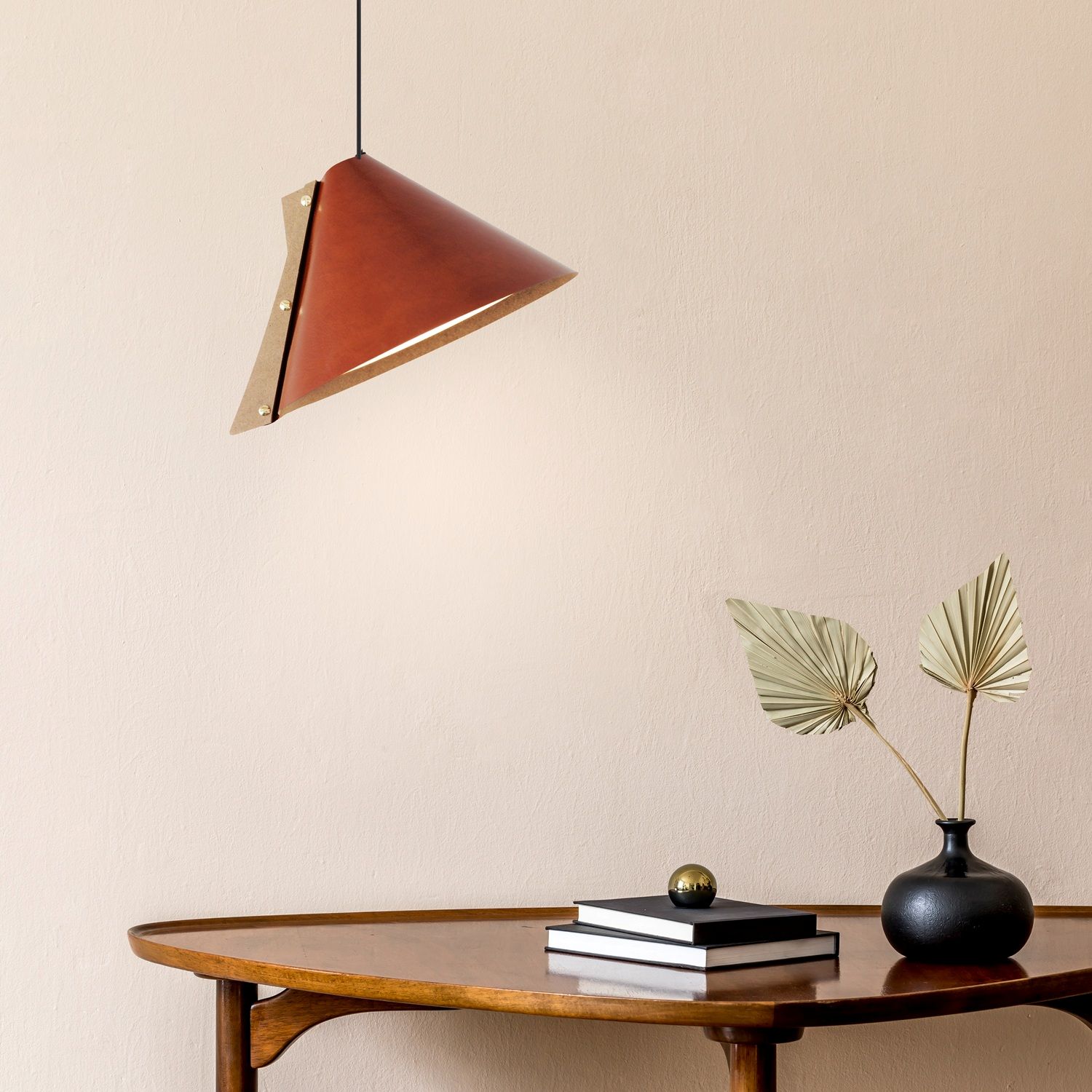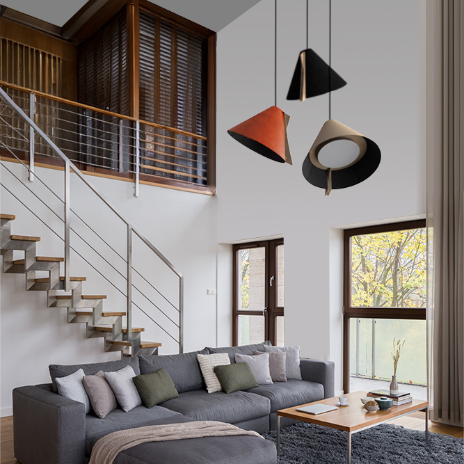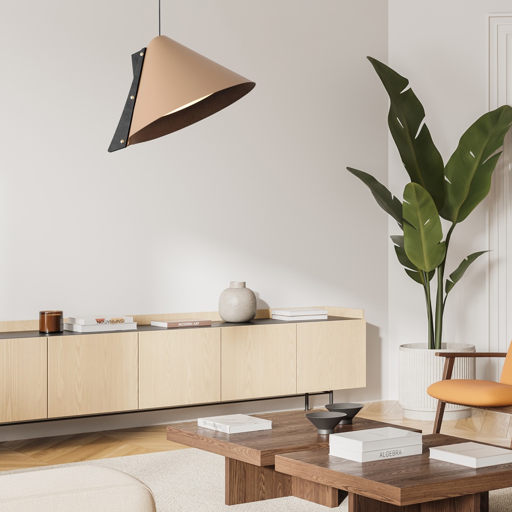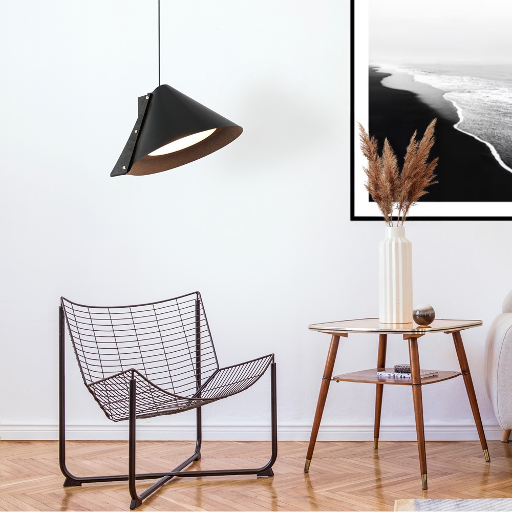 La suspension SILENCE est composée d’un abat-jour en cuir recyclé monté sur une structure en bois recyclé également. L’inclinaison de son cône revisité ajoute une touche d’originalité à l’ensemble. La visserie couleur laiton souligne avec raffinement le jeu des matières. Son design est résolument contemporain et sculptural, jouant avec les volumes et les couleurs des abat-jours. Pour un effet ultra graphique, accrochez les en grappe à différentes hauteurs.