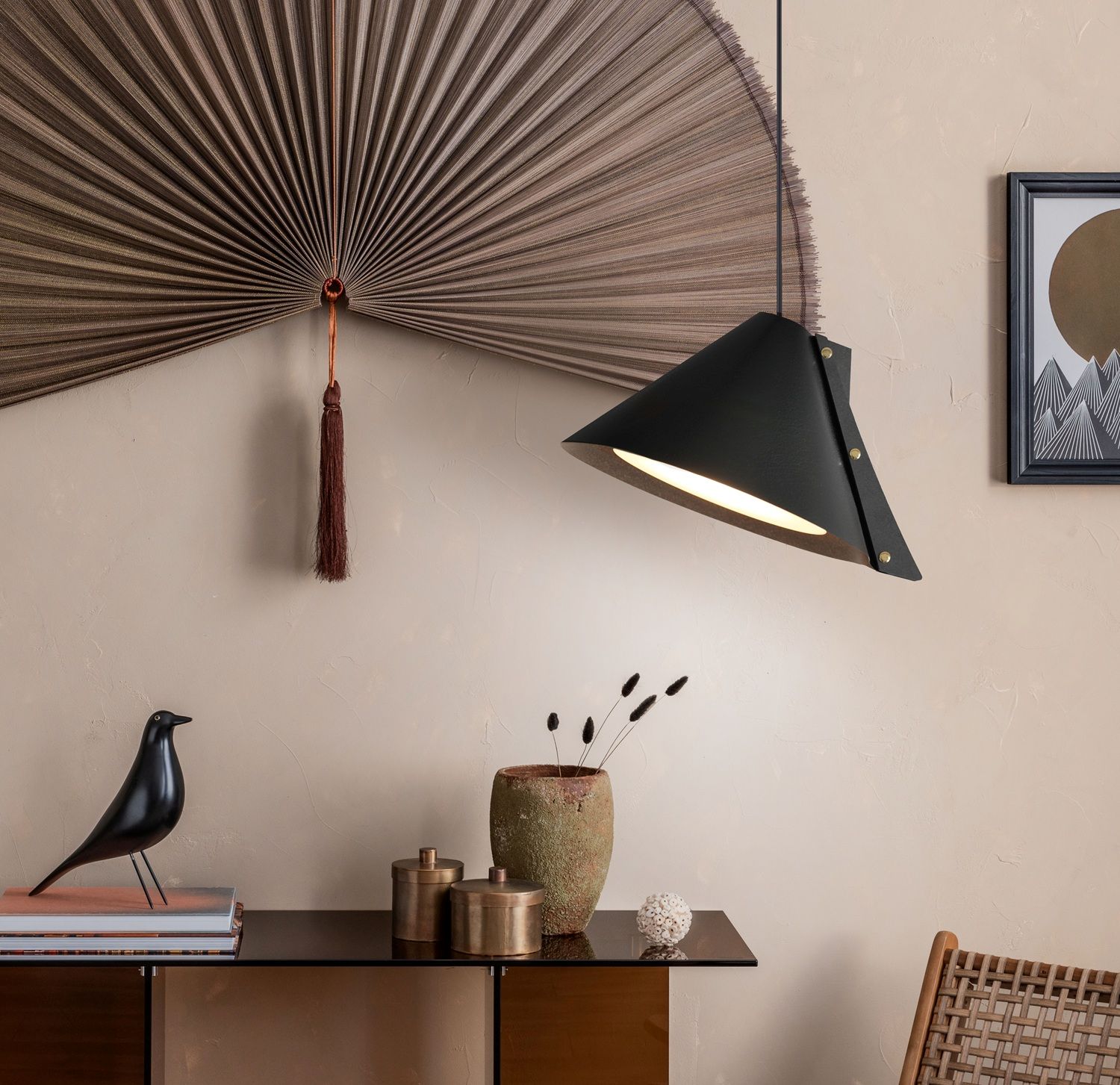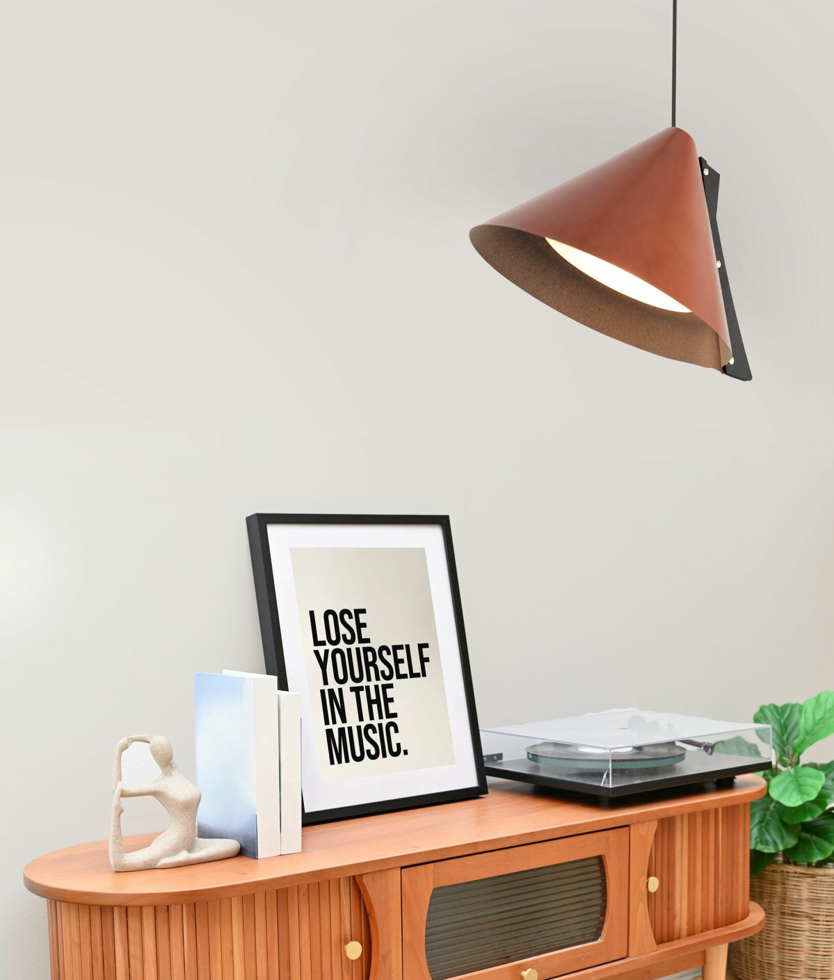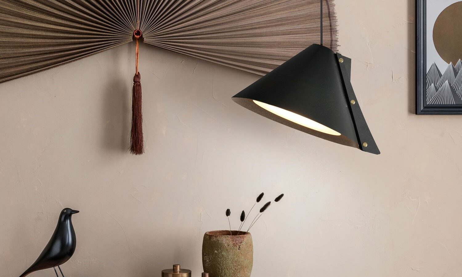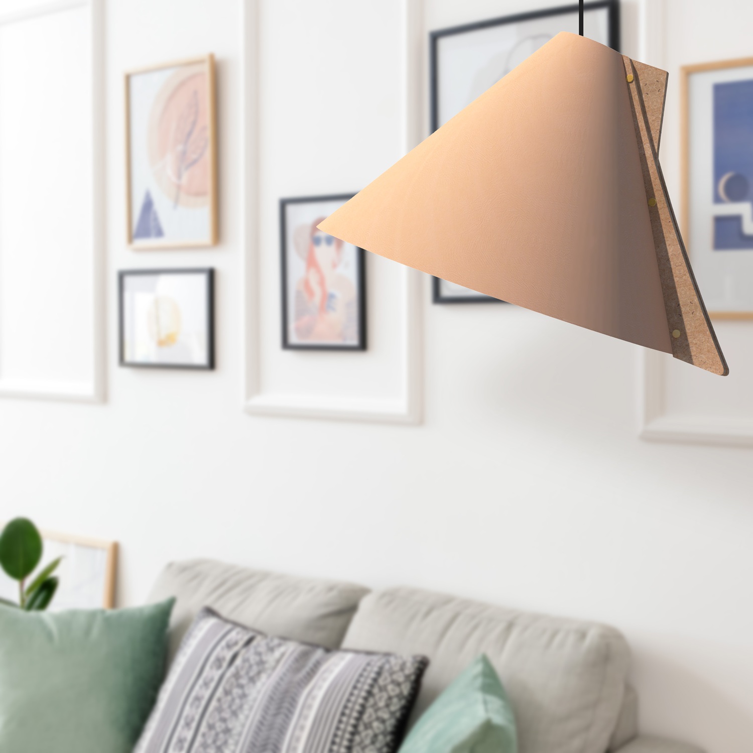 La suspension SILENCE est composée d’un abat-jour en cuir recyclé monté sur une structure en bois recyclé également. L’inclinaison de son cône revisité ajoute une touche d’originalité à l’ensemble. La visserie couleur laiton souligne avec raffinement le jeu des matières. Son design est résolument contemporain et sculptural, jouant avec les volumes et les couleurs des abat-jours. Pour un effet ultra graphique, accrochez les en grappe à différentes hauteurs.